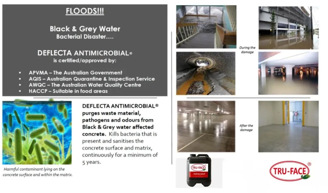 由于澳大利亞四周被海洋包圍,雨水充沛,尤其是昆士蘭州等北部靠近赤道區(qū)域,每年雨季都會發(fā)生洪澇災(zāi)害。等洪水退去,被浸泡過的民居、地下停車場、辦公樓等亟待有效修復(fù)。由于洪水多夾雜下水道的污水、糞水和油漬,被其浸染過的建筑如不經(jīng)有效的消毒、除菌、防霉處理,即便更換了所有表面材料,其結(jié)構(gòu)內(nèi)部殘留的臟污極易引發(fā)細(xì)菌霉菌繁殖,埋下致病隱患,甚至引發(fā)二次腐爛。