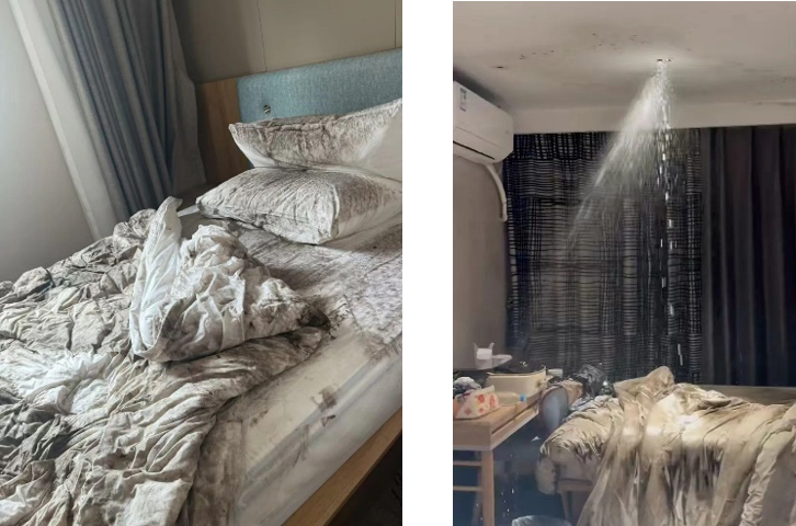 據(jù)“瀟湘晨報”的報道,前段時間,有廣州一酒店的住客投訴因房間的消防噴淋頭半夜爆裂,大量污水從頭頂澆灌導(dǎo)致自己及朋友受到嚴(yán)重驚嚇。房間內(nèi)大量物品受損,被污水浸泡(見下組圖)。酒店方除面臨住客的索償和房間高額的修復(fù)費用以外,還要承受房間無法繼續(xù)經(jīng)營使用的損失,苦不堪言。